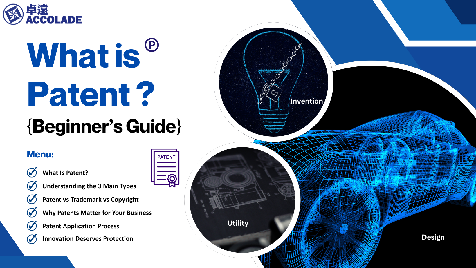 [Beginner's Guide] What Is a Patent? Table of content: What is a Patent? Understanding the 3 Main Types Patent vs Trademark vs Copyright Why Patents Matter for Your Business Patent Application Process Innovation Deserves Protection In today’s innovative-driven economy, a good idea can become your most valuable business asset. But